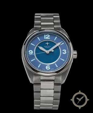 Eine Field-Uhr mit einem markanten 43.5mm Auftritt am Handgelenk, gefertigt aus Edelstahl mit einem Zifferblatt in blau und einer besonderen "textured/grained central disk with smoother outer chapter ring"-Oberfläche.