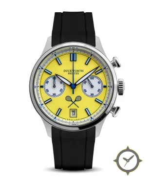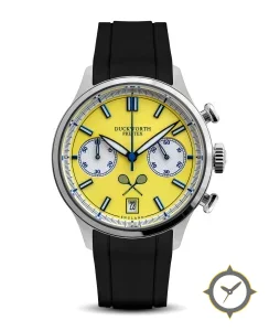 Eine Chronograph-Uhr mit einem markanten 44mm Auftritt am Handgelenk, gefertigt aus Edelstahl mit einem Zifferblatt in gelb und einer besonderen "matte"-Oberfläche.