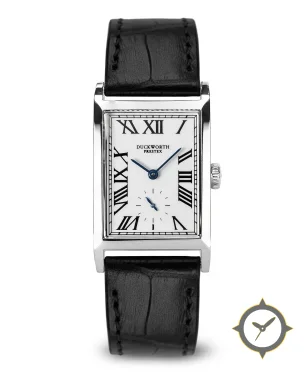 Eine Dress-Uhr mit einem 21mm Gehäuse im Vintage-Stil gefertigt aus Edelstahl mit einem Zifferblatt in weiß und einer besonderen "smooth enamel"-Oberfläche.