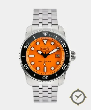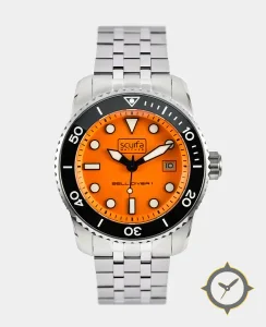 Eine Taucheruhr-Uhr mit einem markanten 48.5mm Auftritt am Handgelenk, gefertigt aus Edelstahl mit einem Zifferblatt in orange und einer besonderen "matte"-Oberfläche.