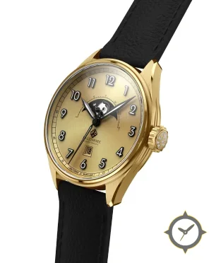 Eine Dress-Uhr mit einem 35mm Gehäuse im Vintage-Stil gefertigt aus Gold mit einem Zifferblatt in gold und einer besonderen "sunburst (radial brushed)"-Oberfläche und einer wunderschönen Mondphasenanzeige.