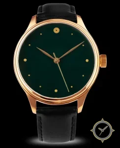 Eine Dress-Uhr mit einem markanten 45.5mm Auftritt am Handgelenk, gefertigt aus Gold mit einem Zifferblatt in grün und einer besonderen "lacquer"-Oberfläche.