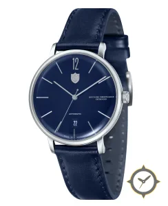 Eine Minimalistisch-Uhr mit einem 32mm Gehäuse im Vintage-Stil gefertigt aus Edelstahl mit einem Zifferblatt in marineblau und einer besonderen "lacquer"-Oberfläche.
