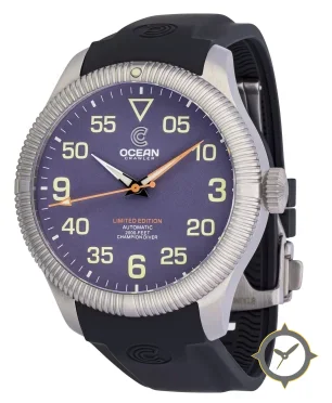 Eine Taucheruhr-Uhr mit einem markanten 52mm Auftritt am Handgelenk, gefertigt aus Edelstahl mit einem Zifferblatt in blau und einer besonderen "matte"-Oberfläche.