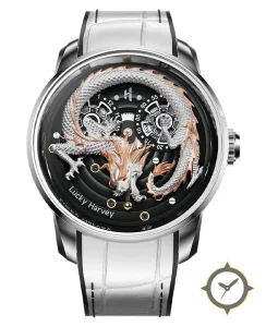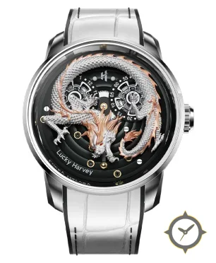 Eine Luxus-Uhr mit einem 35mm Gehäuse im Vintage-Stil gefertigt aus Edelstahl mit einem Zifferblatt in schwarz und einer besonderen "three-dimensional sculpted dragon relief with polished and matte finishes"-Oberfläche.