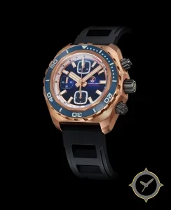 Eine Taucheruhr-Uhr mit einem markanten 48.5mm Auftritt am Handgelenk, gefertigt aus Bronze mit einem Zifferblatt in marineblau und einer besonderen "sunburst"-Oberfläche.