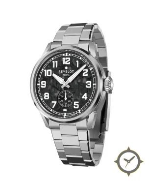 Eine Field-Uhr mit einem vielseitigen 41mm Gehäuse, das an fast jedes Handgelenk passt, gefertigt aus Edelstahl mit einem Zifferblatt in schwarz und einer besonderen "forged-carbon / marbled texture"-Oberfläche.