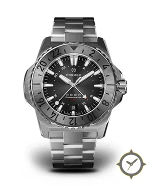 Eine GMT-Uhr mit einem markanten 46mm Auftritt am Handgelenk, gefertigt aus Edelstahl mit einem Zifferblatt in schwarz und einer besonderen "sunburst (radial brushed)"-Oberfläche und einer echten GMT-Funktion, mit der du eine zweite Zeitzone verfolgen kannst.