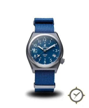 Eine Field-Uhr mit einem 37.5mm Gehäuse im Vintage-Stil gefertigt aus Titan mit einem Zifferblatt in blau und einer besonderen "sunburst"-Oberfläche.