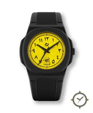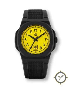Eine Sport-Uhr mit einem vielseitigen 39mm Gehäuse, das an fast jedes Handgelenk passt, gefertigt aus Edelstahl mit einem Zifferblatt in gelb und einer besonderen "granular/pebbled texture"-Oberfläche.