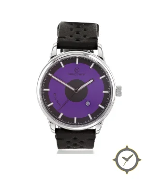 Eine Minimalistisch-Uhr mit einem markanten 47.5mm Auftritt am Handgelenk, gefertigt aus Edelstahl mit einem Zifferblatt in lila und einer besonderen "smooth"-Oberfläche.