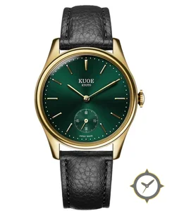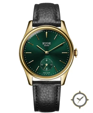 Eine Dress-Uhr mit einem 30.5mm Gehäuse im Vintage-Stil gefertigt aus Gold mit einem Zifferblatt in grün und einer besonderen "sunburst"-Oberfläche.