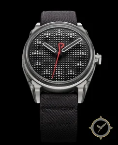 Eine Minimalistisch-Uhr mit einem vielseitigen 40.5mm Gehäuse, das an fast jedes Handgelenk passt, gefertigt aus Titan mit einem Zifferblatt in schwarz und einer besonderen "three-dimensional raised dot/stud texture"-Oberfläche.