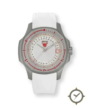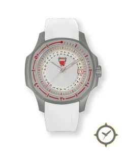 Eine Sport-Uhr mit einem markanten 41.5mm Auftritt am Handgelenk, gefertigt aus Titan mit einem Zifferblatt in weiß und einer besonderen "smooth lacquer"-Oberfläche.
