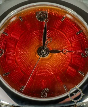 Eine Dress-Uhr mit einem markanten 42.5mm Auftritt am Handgelenk, gefertigt aus Edelstahl mit einem Zifferblatt in rot und einer besonderen "guilloche"-Oberfläche.