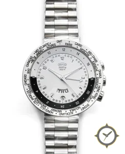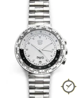 Eine Weltzeituhr-Uhr mit einem 37mm Gehäuse im Vintage-Stil gefertigt aus Edelstahl mit einem Zifferblatt in weiß und einer besonderen "smooth"-Oberfläche, ideal für Weltenbummler dank der Weltzeit-Funktion.