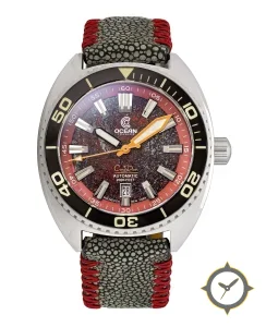 Eine Taucheruhr-Uhr mit einem 36.5mm Gehäuse im Vintage-Stil gefertigt aus Edelstahl mit einem Zifferblatt in rot und einer besonderen "oxidized/distressed granular texture (rust-like)"-Oberfläche.
