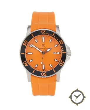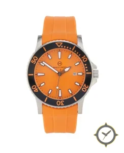 Eine Taucheruhr-Uhr mit einem 35mm Gehäuse im Vintage-Stil gefertigt aus Edelstahl mit einem Zifferblatt in orange und einer besonderen "matte"-Oberfläche.