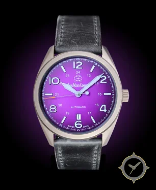 Eine Field-Uhr mit einem vielseitigen 40.5mm Gehäuse, das an fast jedes Handgelenk passt, gefertigt aus Edelstahl mit einem Zifferblatt in lila und einer besonderen "sunburst gradient"-Oberfläche.