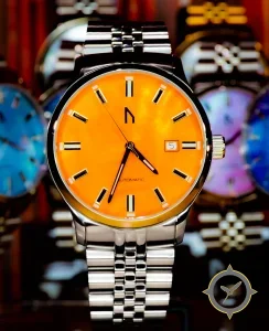 Eine Dress-Uhr gefertigt aus Edelstahl mit einem Zifferblatt in orange und einer besonderen "lacquer"-Oberfläche.