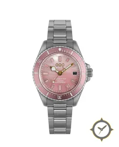 Eine Taucheruhr-Uhr mit einem 30.5mm Gehäuse im Vintage-Stil gefertigt aus Edelstahl mit einem Zifferblatt in weiß und einer besonderen "mother-of-pearl"-Oberfläche.