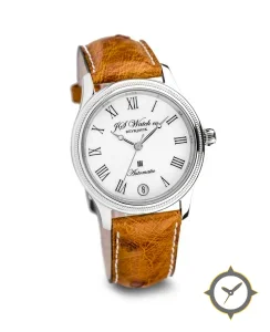 Eine Dress-Uhr mit einem 31.5mm Gehäuse im Vintage-Stil gefertigt aus Edelstahl mit einem Zifferblatt in weiß und einer besonderen "enamel"-Oberfläche.
