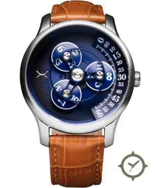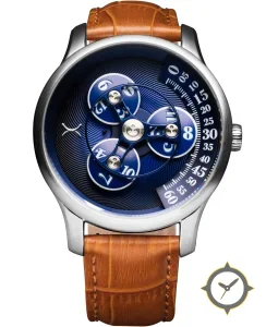 Eine Luxus-Uhr mit einem markanten 50mm Auftritt am Handgelenk, gefertigt aus Edelstahl mit einem Zifferblatt in blau und einer besonderen "concentric guilloché / engraved wave texture"-Oberfläche.