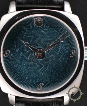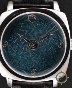 Eine Dress-Uhr mit einem markanten 44mm Auftritt am Handgelenk, gefertigt aus Edelstahl mit einem Zifferblatt in blau und einer besonderen "guilloche"-Oberfläche.