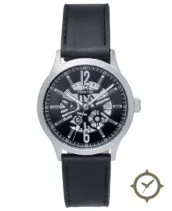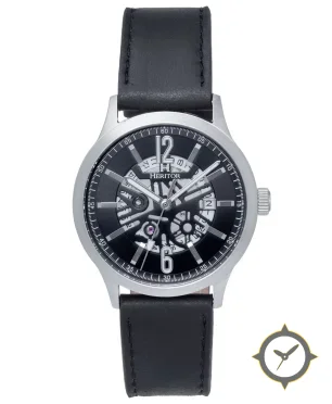 Eine Skelett-Uhr mit einem 36.5mm Gehäuse im Vintage-Stil gefertigt aus Edelstahl mit einem Zifferblatt in schwarz und einer besonderen "open-work / skeleton revealing movement"-Oberfläche.
