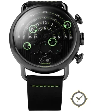 Eine Chronograph-Uhr mit einem vielseitigen 38.5mm Gehäuse, das an fast jedes Handgelenk passt, gefertigt aus Edelstahl mit einem Zifferblatt in schwarz und einer besonderen "vertical ribbed lower half with concentric circular grooves on upper half"-Oberfläche.