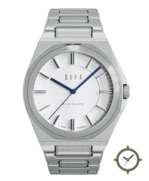 Eine Minimalistisch-Uhr mit einem vielseitigen 40.5mm Gehäuse, das an fast jedes Handgelenk passt, gefertigt aus Edelstahl mit einem Zifferblatt in weiß und einer besonderen "matte with a subtle recessed inner ring"-Oberfläche.