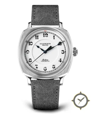 Eine Vintage-Uhr mit einem markanten 42.5mm Auftritt am Handgelenk, gefertigt aus Edelstahl mit einem Zifferblatt in weiß und einer besonderen "enamel (glossy)"-Oberfläche.