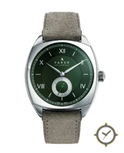 Eine Dress-Uhr mit einem 32mm Gehäuse im Vintage-Stil gefertigt aus Edelstahl mit einem Zifferblatt in grün und einer besonderen "sunburst with matte inner ring"-Oberfläche.