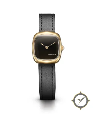 Eine Dress-Uhr mit einem 23.5mm Gehäuse im Vintage-Stil gefertigt aus Gold mit einem Zifferblatt in schwarz und einer besonderen "high-gloss lacquer"-Oberfläche.
