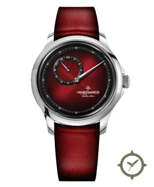 Eine Dress-Uhr mit einem 37mm Gehäuse im Vintage-Stil gefertigt aus Edelstahl mit einem Zifferblatt in karmesinrot und einer besonderen "sunburst (ombré gradient)"-Oberfläche.