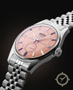 Eine Dress-Uhr mit einem vielseitigen 40mm Gehäuse, das an fast jedes Handgelenk passt, gefertigt aus Edelstahl mit einem Zifferblatt in orange und einer besonderen "glossy, slightly domed"-Oberfläche.