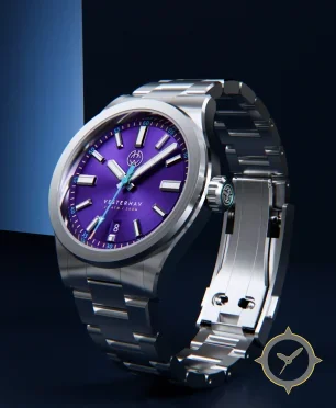 Eine Sport-Uhr mit einem markanten 42mm Auftritt am Handgelenk, gefertigt aus Edelstahl mit einem Zifferblatt in lila und einer besonderen "sunburst"-Oberfläche.
