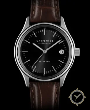 Eine Dress-Uhr mit einem 32mm Gehäuse im Vintage-Stil gefertigt aus Edelstahl mit einem Zifferblatt in schwarz und einer besonderen "sunburst"-Oberfläche.
