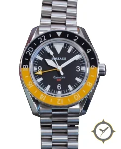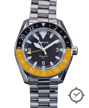 Eine GMT-Uhr mit einem 33mm Gehäuse im Vintage-Stil gefertigt aus Edelstahl mit einem Zifferblatt in schwarz und einer besonderen "matte"-Oberfläche und einer echten GMT-Funktion, mit der du eine zweite Zeitzone verfolgen kannst.
