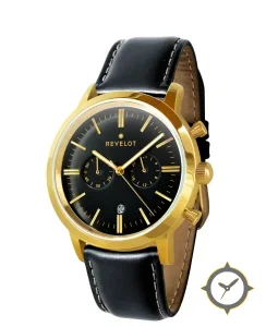 Eine Chronograph-Uhr mit einem 37.5mm Gehäuse im Vintage-Stil gefertigt aus Gold mit einem Zifferblatt in schwarz und einer besonderen "sunburst"-Oberfläche.