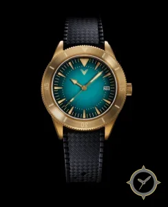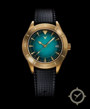 Eine Taucheruhr-Uhr mit einem 35mm Gehäuse im Vintage-Stil gefertigt aus Bronze mit einem Zifferblatt in türkis und einer besonderen "sunburst"-Oberfläche.