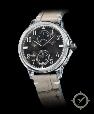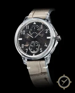 Eine Skelett-Uhr mit einem markanten 49.5mm Auftritt am Handgelenk, gefertigt aus Saphir mit einem Zifferblatt in schwarz und einer besonderen "open-work / skeletonized revealing movement"-Oberfläche und einer praktischen Gangreserveanzeige.