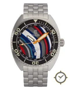 Eine Taucheruhr-Uhr mit einem markanten 49mm Auftritt am Handgelenk, gefertigt aus Edelstahl mit einem Zifferblatt in blau und einer besonderen "multicolored raised painted stripes (textured surface)"-Oberfläche.