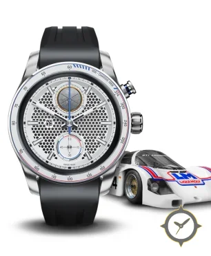 Eine Racing-Uhr mit einem 33mm Gehäuse im Vintage-Stil gefertigt aus Edelstahl mit einem Zifferblatt in weiß und einer besonderen "open honeycomb / textured grille"-Oberfläche und einer echten GMT-Funktion, mit der du eine zweite Zeitzone verfolgen kannst.