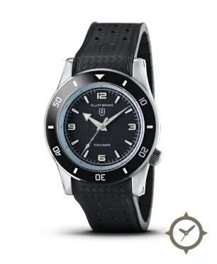Eine Taucheruhr-Uhr gefertigt aus Edelstahl mit einem Zifferblatt in schwarz und einer besonderen "textured wavy/grooved surface"-Oberfläche.