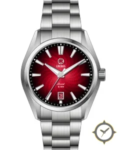 Eine Sport-Uhr mit einem markanten 43.5mm Auftritt am Handgelenk, gefertigt aus Edelstahl mit einem Zifferblatt in rot und einer besonderen "guilloche / radial patterned lacquer"-Oberfläche.