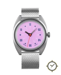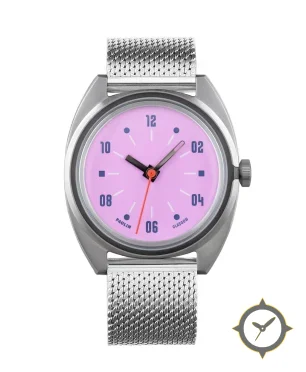 Eine Minimalistisch-Uhr mit einem markanten 46mm Auftritt am Handgelenk, gefertigt aus Edelstahl mit einem Zifferblatt in lila und einer besonderen "matte"-Oberfläche.