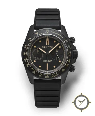 Eine Chronograph-Uhr mit einem markanten 47.5mm Auftritt am Handgelenk, gefertigt aus Edelstahl mit einem Zifferblatt in schwarz und einer besonderen "matte"-Oberfläche.