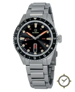 Eine Taucheruhr-Uhr mit einem 35.5mm Gehäuse im Vintage-Stil gefertigt aus Edelstahl mit einem Zifferblatt in schwarz und einer besonderen "sunburst"-Oberfläche.