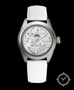 Eine Sport-Uhr mit einem markanten 44.5mm Auftritt am Handgelenk, gefertigt aus Titan mit einem Zifferblatt in weiß und einer besonderen "engraved/etched illustrated doodle texture"-Oberfläche.